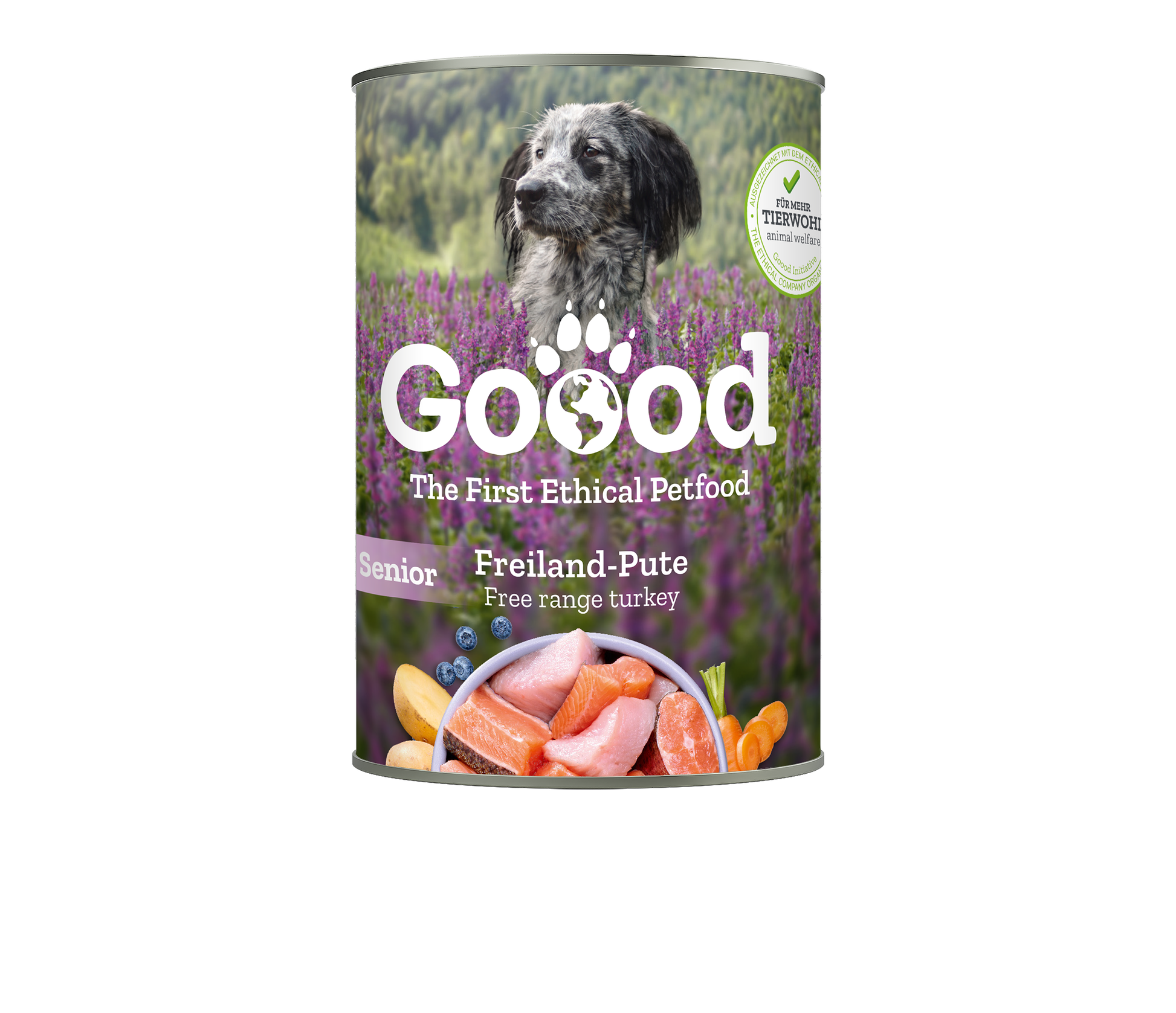 Easily digestible wet food with free-range turkey for senior dogs Happy, free-range turkeys that are only fed natural foods such as seeds, worms and berries provide the tender turkey meat for our Goood dog food.